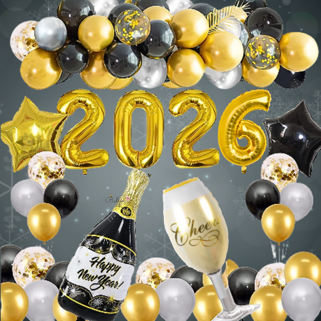 SILVESTER 2026 BALLONDEKOR in Schwarz, Gold, Silber